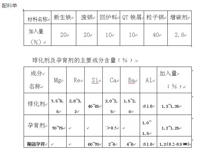CE4.6-4.8,C3.6-3.9,Si1.2-1.3(原)、2.65-2.9(終),Mn0.2-0.4,P≦0.05,S≤O.035(原)、≤0.022(終),RE(殘)0.02-0.04, Mg(殘)0.03-0.06。