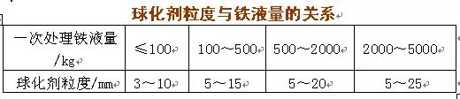 球化劑的粒度是影響反應(yīng)速度的一個(gè)重要因數(shù),需要經(jīng)過(guò)用戶允許。球化劑粒度大小主要與一次處理的鐵液量有關(guān)(見(jiàn)附表)。此外還與鐵液包形狀、球化劑覆蓋程度,以及鐵液溫度等諸多因素有關(guān)。一般而言,粒度過(guò)大易引起早爆和漂;粒度過(guò)小, 在鐵液溫度不足時(shí),極易結(jié)死包底。以上兩種情況,都影響球化劑收得率,影響球化的穩(wěn)定性。注意尺寸太小特別是粉狀球化劑在生產(chǎn)中是不能應(yīng)用的。一般情況下,超標(biāo)的球化劑量應(yīng)小于10%。