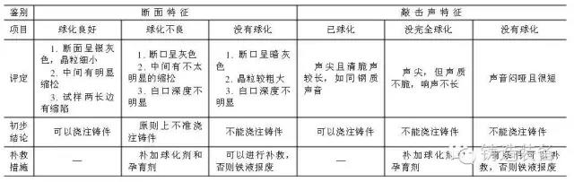 球處理完畢后,用樣勺澆注一塊厚10mm左右的試塊,冷卻至暗紅色,淬火擊斷后,如發(fā)現(xiàn)試塊上表面有一道黑邊,則表示球化不良,且黑邊越厚,球化越差,產生衰退,此時如鐵液溫度高可補加合金。從試塊上還可看出:如試塊周圍成圓弧狀,并中間凹陷,有的還有一道道皺紋,則也表示球化良好;如試塊上表面有麥皮狀的點,則表示鐵液氧化,易于衰退。在這種情況下,應對爐子進行改造。